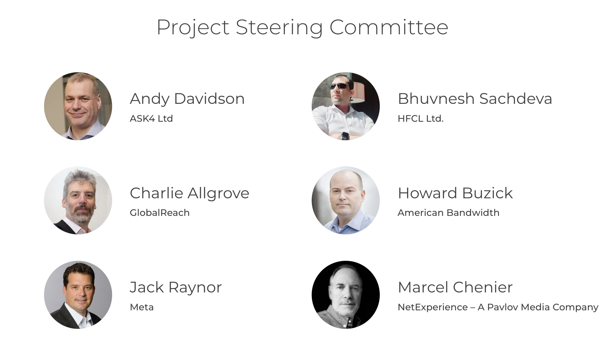 These co-chairs join the expanded Project Steering Committee (PSC) along with existing members: Andy Davidson, Group CTO, ASK4 Ltd; Bhuvnesh Sachdeva, SVP, HFCL Ltd; Marcel Chénier, CTO and Co-Founder, NetExperience—A Pavlov Media Company; and Udit Mehrotra, CEO, Shyam Spectra, Private Limited.