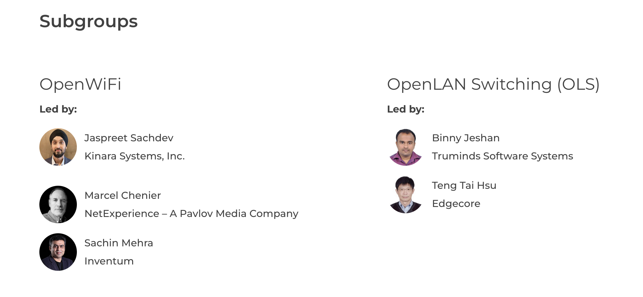 In addition to leadership changes at the PG level, both the OpenWiFi and OpenLAN Switching Subgroups have also named new slates of Co-Leads. In OpenWiFi, Jaspreet Sachdev, Co-Founder & Co-CEO, Kinara Systems, Inc., Marcel Chénier, CTO and Co-Founder, NetExperience – A Pavlov Media Company, and Sachin Mehra, Managing Director and Founder, Inventum are now Co-Leads. Similarly, the OpenLAN Switching Subgroup leaders are now Binny Jeshan, Solutions Architect, Truminds Software Systems, and Teng Tai Hsu, Vice President, Edgecore.