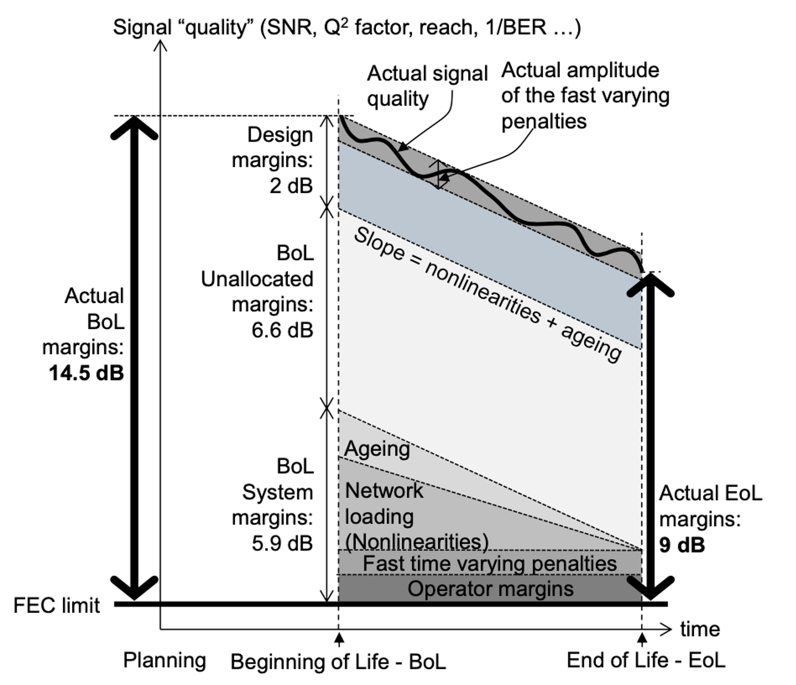 Optical networks need to be operated with sufficient Signal Quality Margin to enable reliable data transport during the lifetime of the equipment. A detailed discussion about margins can be found in (Design of low-margin optical networks, Jan. 2017) from where Figure 1 is depicted: