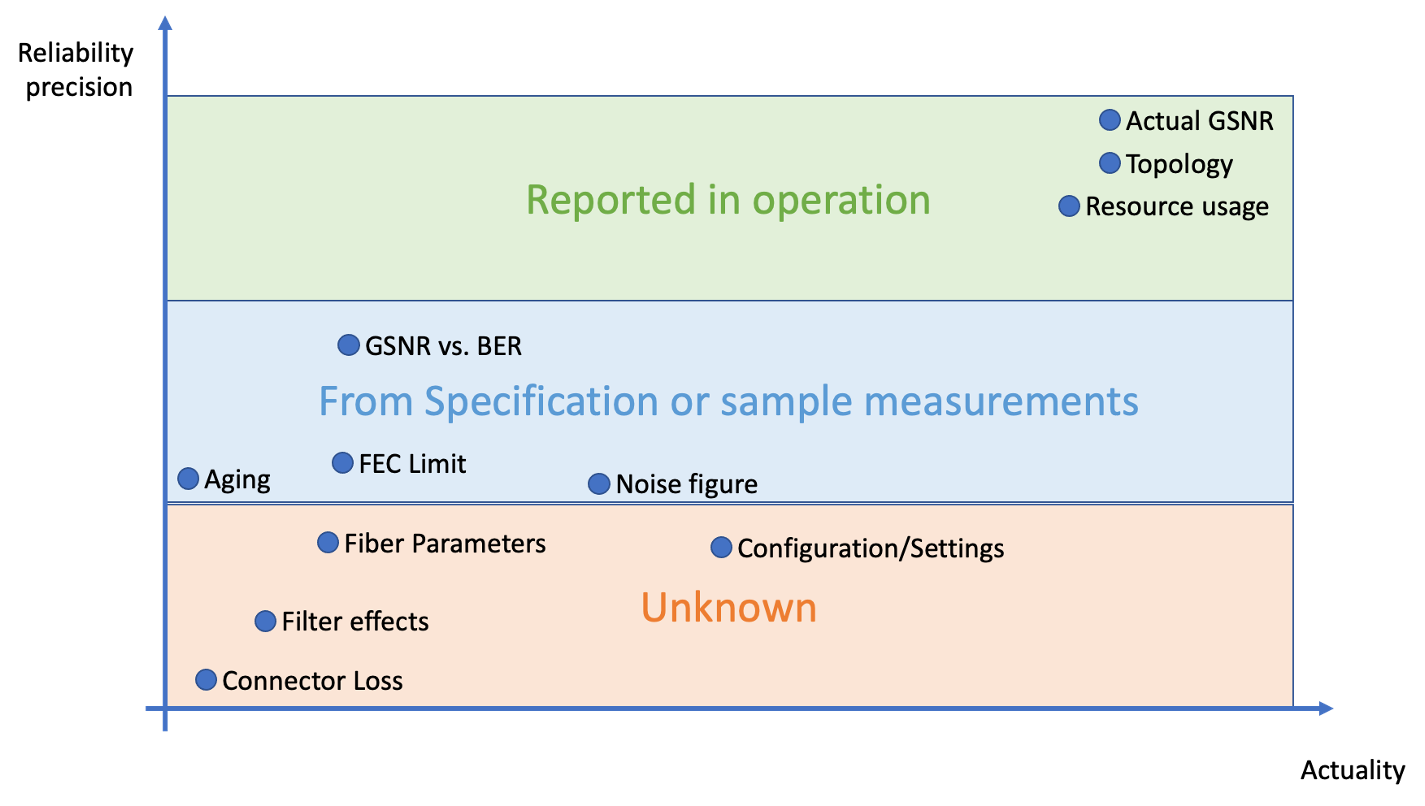 Where Specifications or sample measurements pre-installation are available, it is possible to obtain basic information. However, by nature specifications define the worst case and need to consider margins that are not disclosed. In contrast, sample measurements provide only a snapshot for a single entity but cannot predict sample-to-sample variations, nor actual EOL margins. Other parameters can be retrieved on demand from the actual optical network such as topology and resource usage. Compiling these parameters of vastly different quality in a single model to predict a Target-Quality of Transmission (QoT) is challenging.