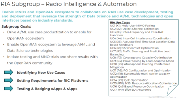 The Radio Intelligence & Automation (RIA) subgroup focuses on RAN Intelligent Controller (RIC) Use Cases by defining Use Case requirements and developing the Use Case test plans. The subgroup participants collaborate to enable the community to develop x/rApps and set the RIC Platform requirements.