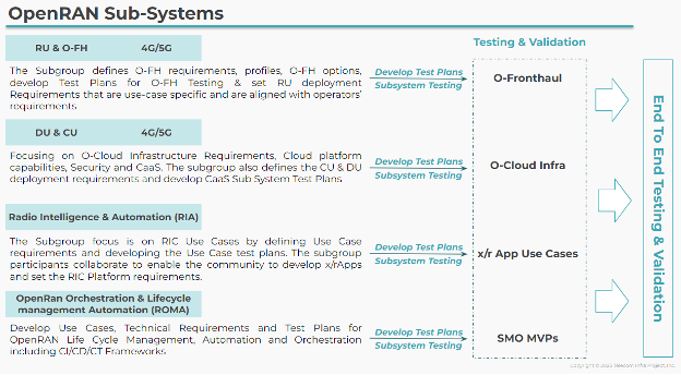 In addition to adding Radio specifications and bands to the detailed requirements and badging 10+ products, the O-RU subgroup is creating Open-Fronthaul (O-FH) configurations. Integrating the O-FH has always been a challenge ever since OpenRAN existed. The different deployment scenarios and the wide-ranging O-FH options within the O-RAN standards made a compounded challenge by prolonging the integration time and fragmenting the RU/CU/DU industry. The subgroup is bringing industry leaders together to define distinct O-FH profiles based on specific deployment scenarios to reduce the O-RU integration time and work towards a “Plug-n-Play” O-RU integration.