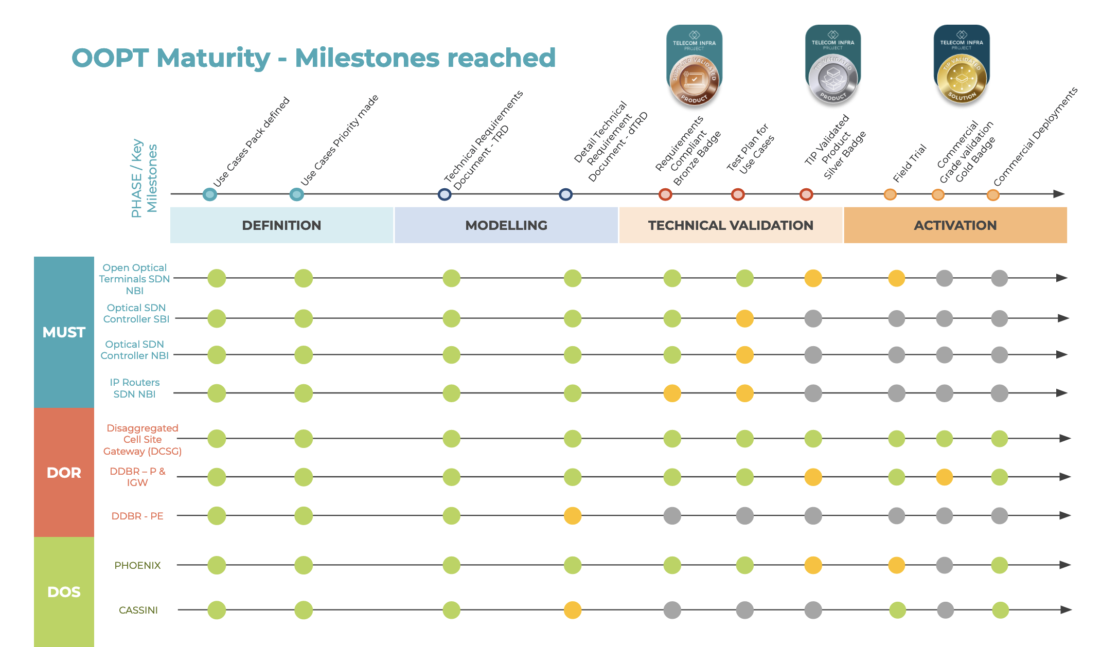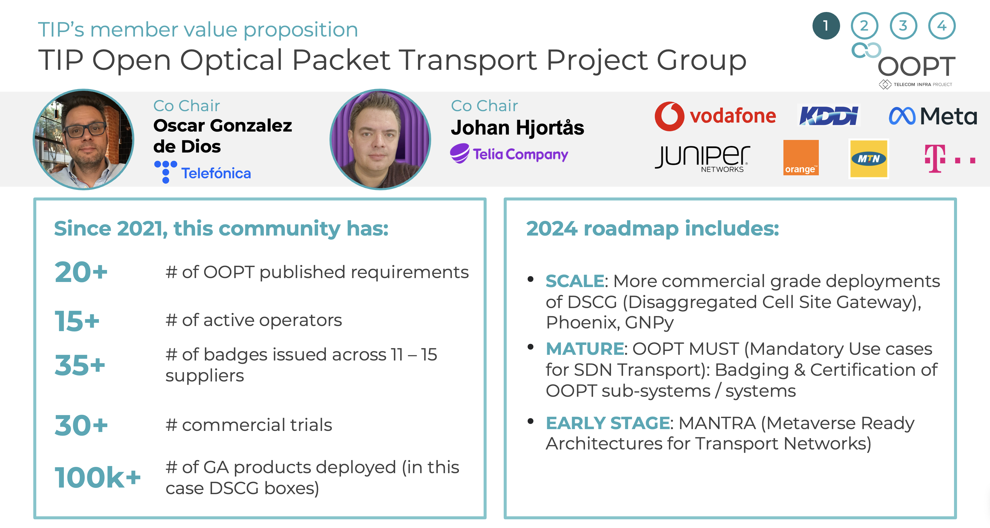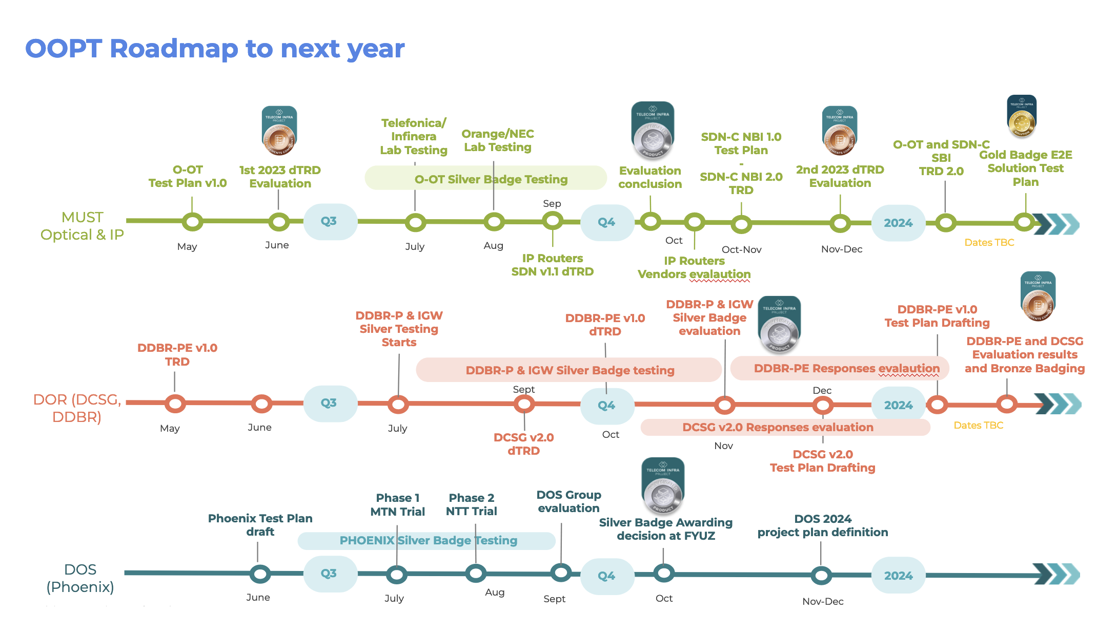The vendor community has embraced OOPT technical requirements, with over 35 products receiving certification through the TIP Test and Validation program. Additionally, the introduction of bronze badges, awarded to MUST-compliant SDN-Controller solutions northbound and southbound interfaces, showcases the growing ecosystem, with key partnerships formed with Edgecore, Drivenets, and Capgemini.