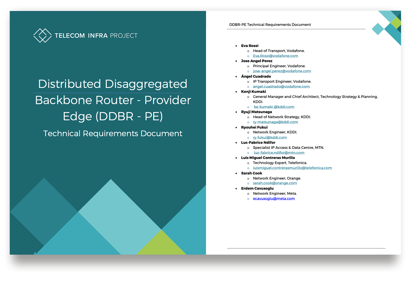 Diego Marí Moretón (Meta)This group works on the definition of open and disaggregated routers including Core (P), Provider Edge (PE), Aggregation Routers, Internet Gateways and Cell Site Gateway Devices that operators can deploy in their IP/MPLS networks and 2G/3G/4G and 5G cell sites. The team produces technical specifications that define software, hardware and API requirements that represent the needs of mobile / fixed network operators and build solutions meeting that specification through industry partners and Technology providers.