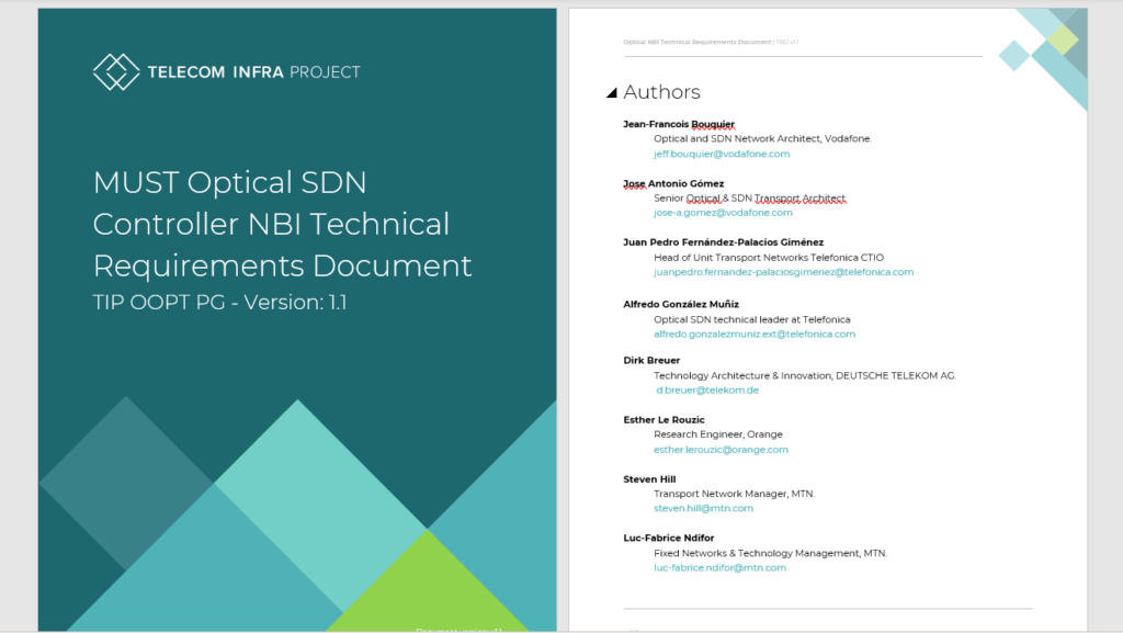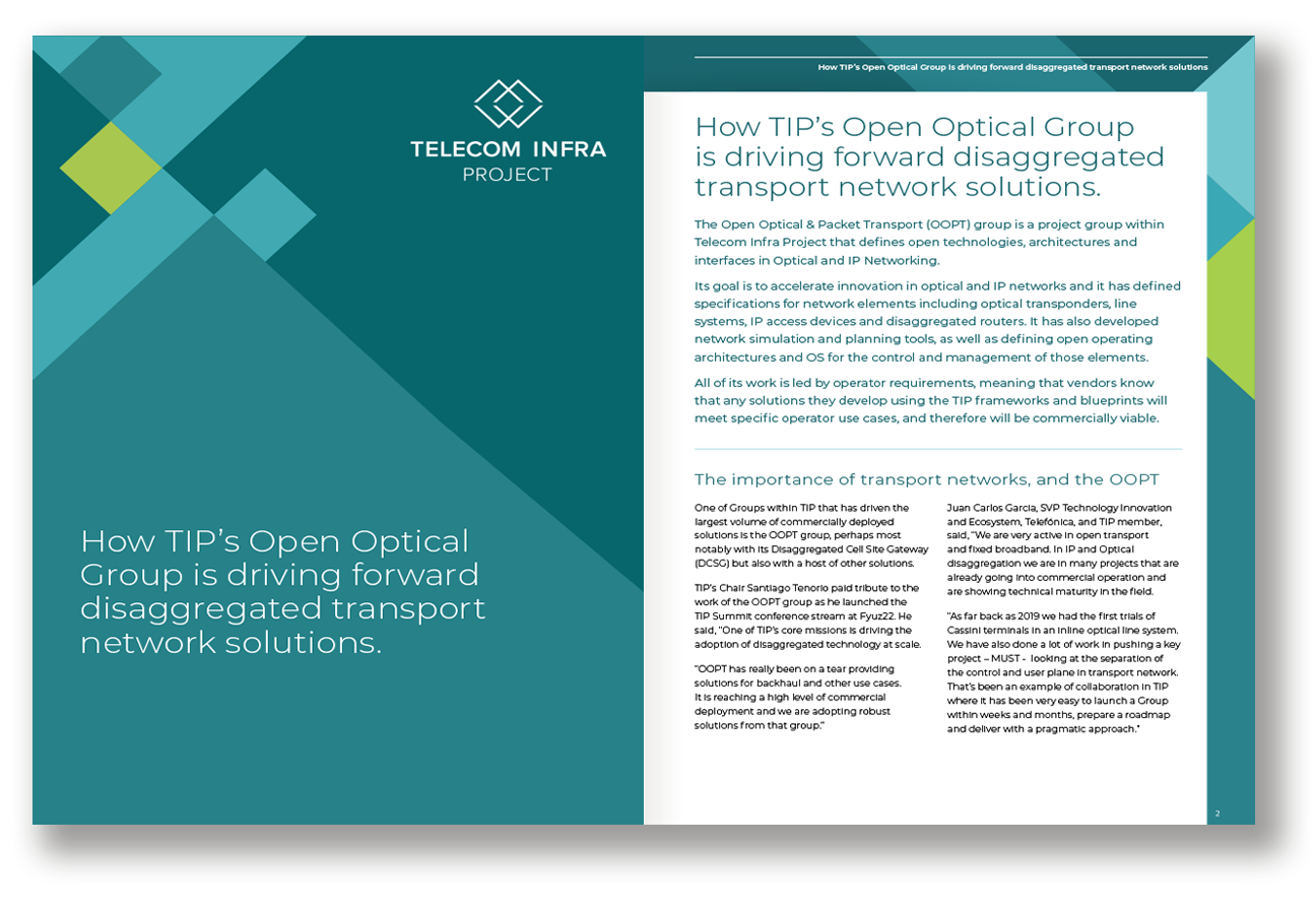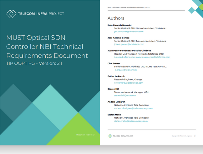 The Open Optical & Packet Transport group is a project group within Telecom Infra Project that works on the definition of open technologies, architectures and interfaces in Optical and IP Networking.