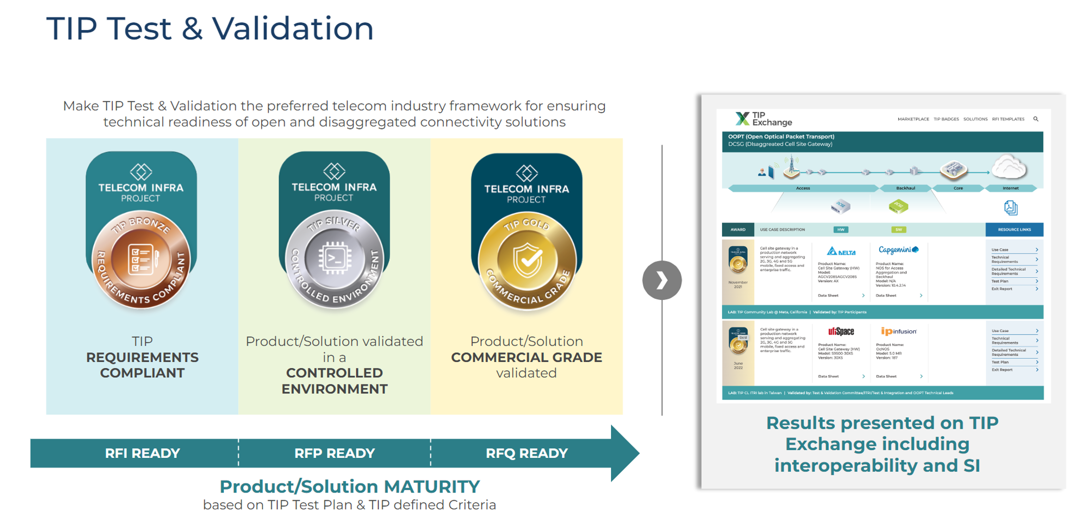 The three-tier badging system was introduced to demonstrate the increasing maturity and interoperability of individual products, product combinations, or solutions. Bronze badges demonstrate a vendor’s self-assessed compliance with TIP requirements, while silver and gold badges involve increasing levels of testing.