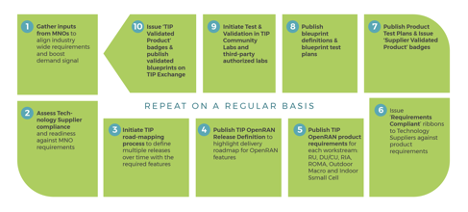 TIP OpenRAN release framework breaks down the consolidated Open RAN requirements into multiple TIP Releases based on MNO’s priorities and vendor’s readiness. The ten step process is illustrated below. This foundational framework will allow additional MNOs to further add their requirements and for vendor’s to adjust their roadmaps based on MNO’s priorities.