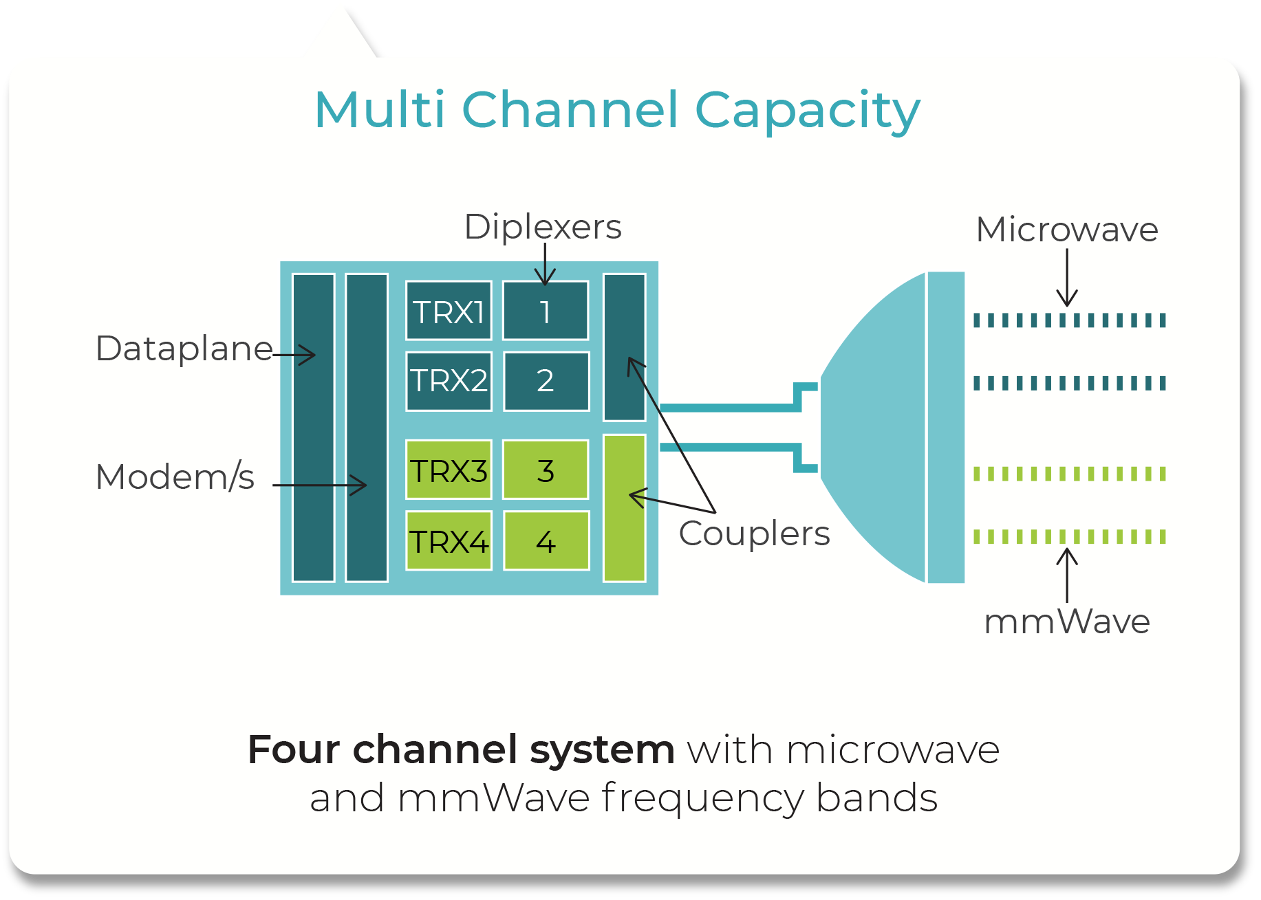 - Boosting backhaul capacity with Dual Frequency bands, reducing the footprint on towers and extending the reach of millimeter waves (mmWave) while maintaining high overall availability.