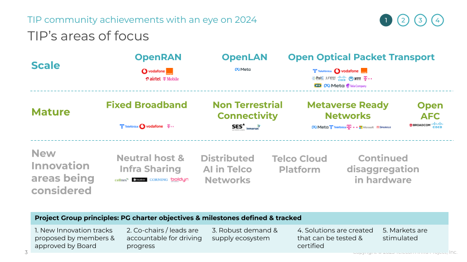 Since its establishment in 2016, TIP has been dedicated to catalyzing global adoption and fostering innovation in open and disaggregated technologies. Our diverse community, consisting of telecom operators, OEMs, chipset manufacturers, software and hardware providers, system integrators, and more, has played a pivotal role in advancing technology and pushing the boundaries of the telecommunications industry, resulting in positive transformative changes.