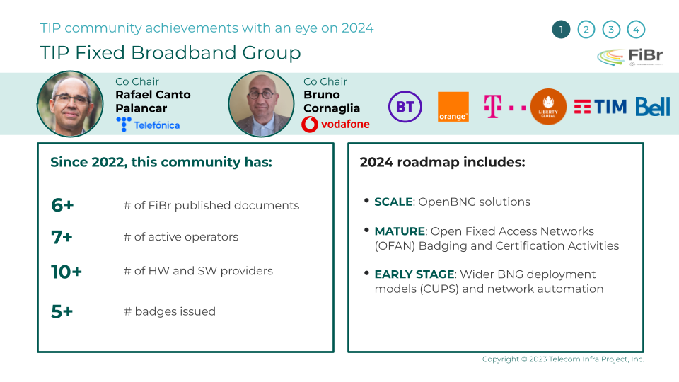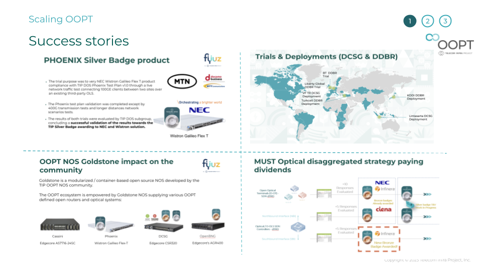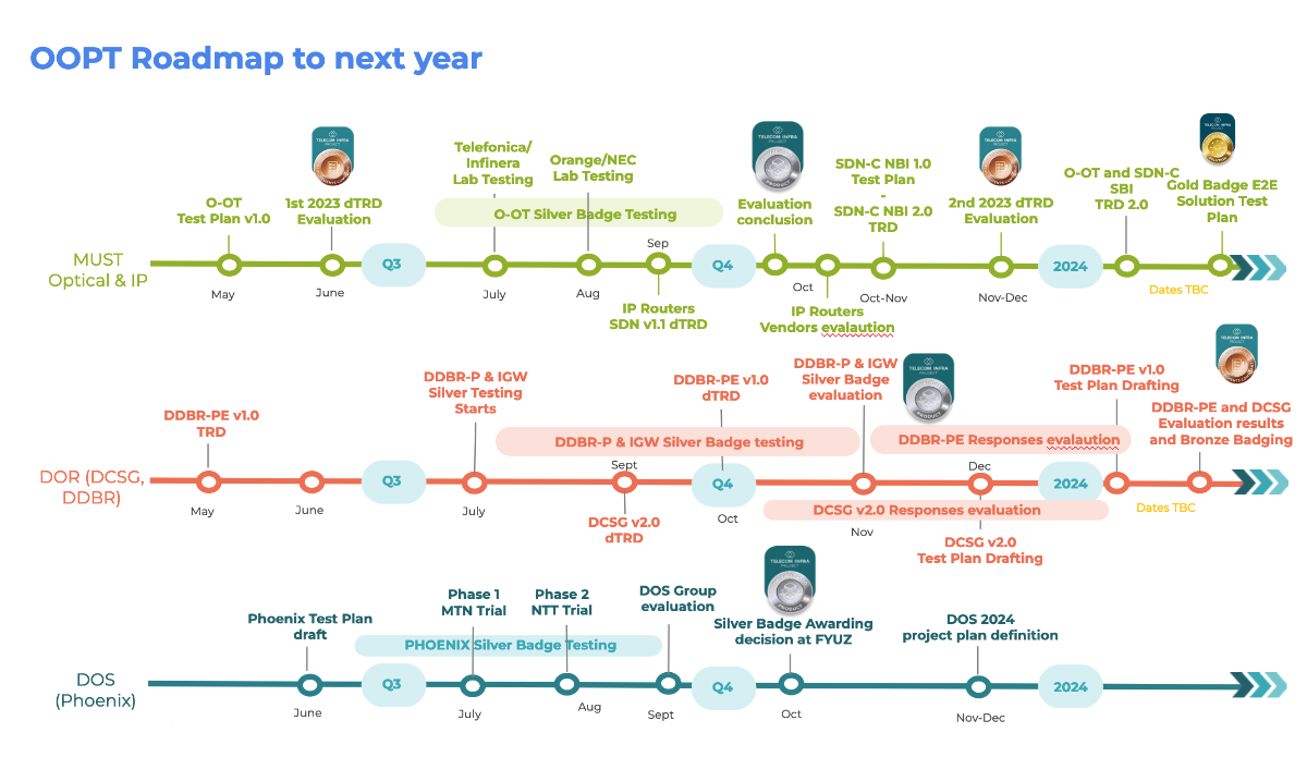 Moreover, the OOPT community has released in the last quarter of the year, the new release of DCSG 2.0 and the Disaggregated Distributed Backbone PE Routers (DDBR-PE) detailed technical requirements which pave the way for evaluating the first Requirements Compliant products to be awarded with TIP Bronze Badges early next year. On top of this, the MUST subgroup has also updated its technical requirements for both IP and Optical transport solutions and it is currently evaluating the products compliance which are ready to start interoperability testing in 2024.