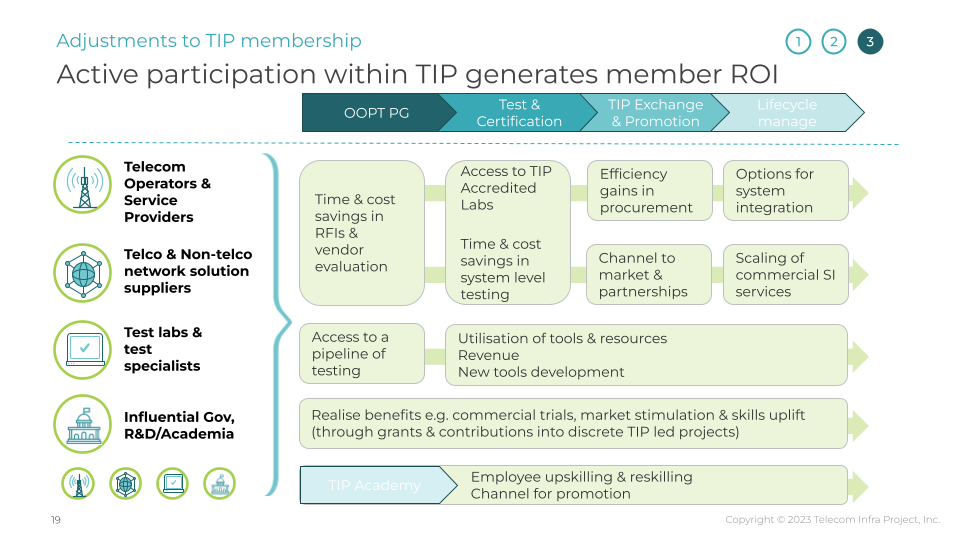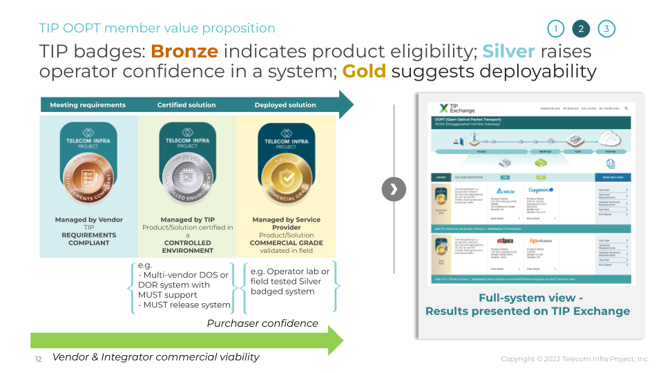 - System integrators and participating certification labs will have access to a robust certification process and operator requirements on certification through TIP.