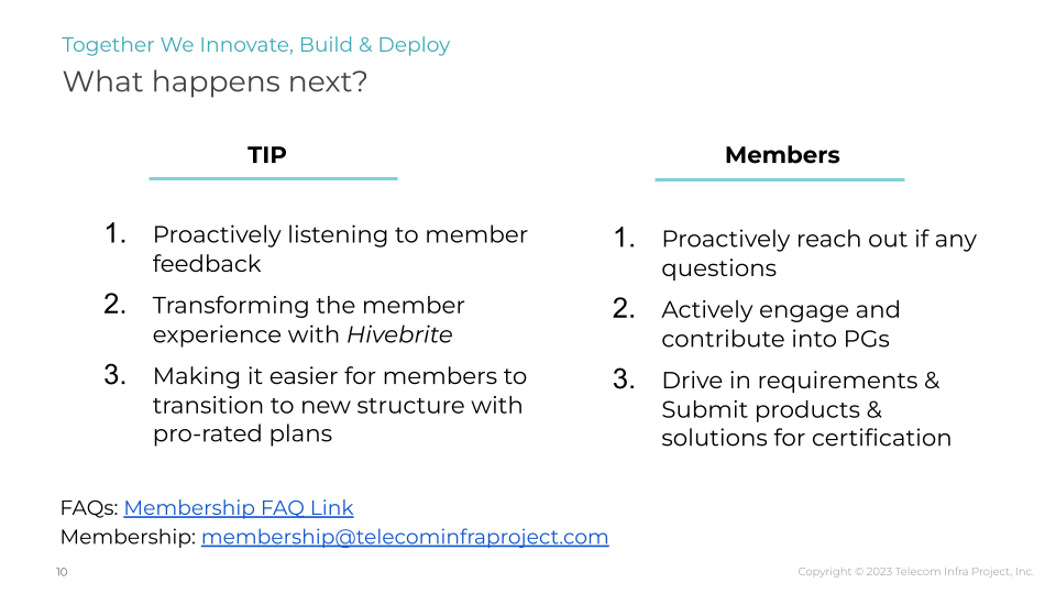 We are looking forward to engaging with our community in 2024. The next steps involve a dedicated focus on member engagement and experience enhancement. TIP is actively listening to member feedback, facilitating a transformative shift in the member experience through the implementation of Hivebrite. This transition is further streamlined with the introduction of pro-rated plans, ensuring that members can seamlessly adapt to the new structure. To foster a collaborative atmosphere, TIP encourages members to proactively reach out with any queries, actively engage, and contribute to the various Project Groups (PGs). Members are pivotal in driving requirements and are invited to submit products and solutions for certification. Comprehensive information and clarifications can be found in the Membership FAQs, accessible through the provided link, while inquiries can be directed to [email protected] for further assistance. The proactive engagement and collaborative efforts of members play a crucial role in shaping the trajectory and success of the TIP community.