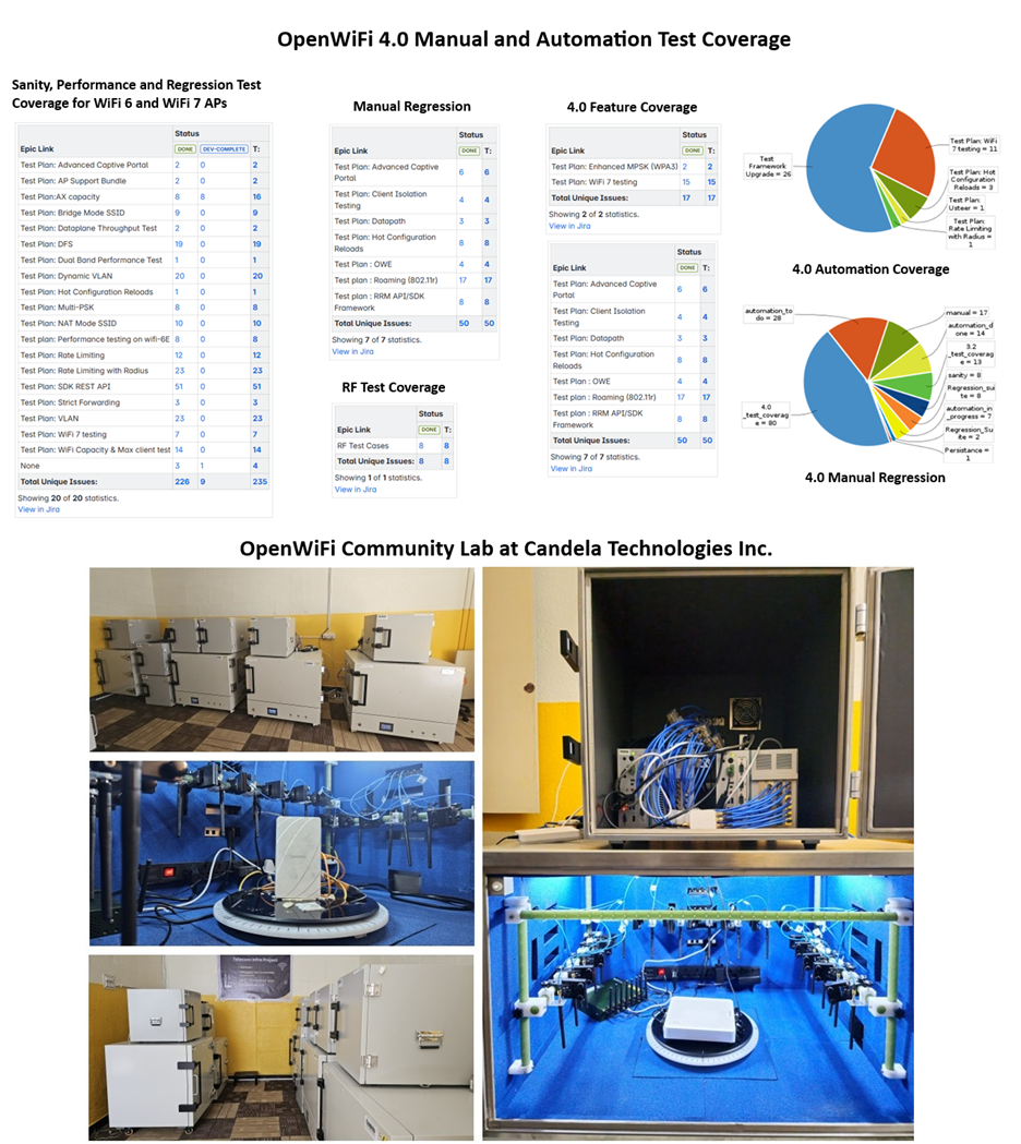 OpenWiFitm 4.0 extends its support to a wide range of DUTs from community partners, including Edgecore, CIG, Cybertan, HFCL, Inventum, Andrena, and Senao. These devices have undergone extensive development and testing cycles, covering critical features such as EMPSK, Rate Limiting, Roaming, Band Steering, Captive Portal, TR398, peak throughput, scalability, and range optimization. The below images provide a detailed overview of the 4.0 release coverage and test environment. For more information on supported features, reach out to [email protected].
