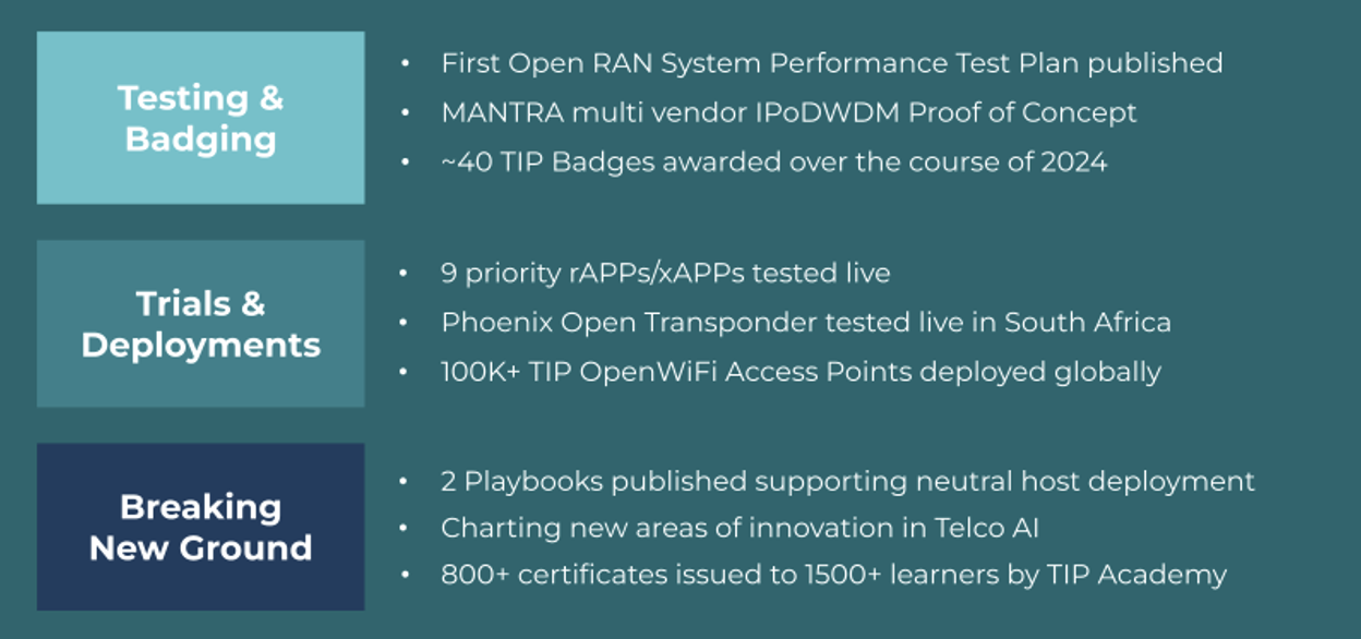 In 2024, TIP’s Project Groups demonstrated remarkable progress, driving innovation across Open RAN, Optical Transport, Telco AI, and more.