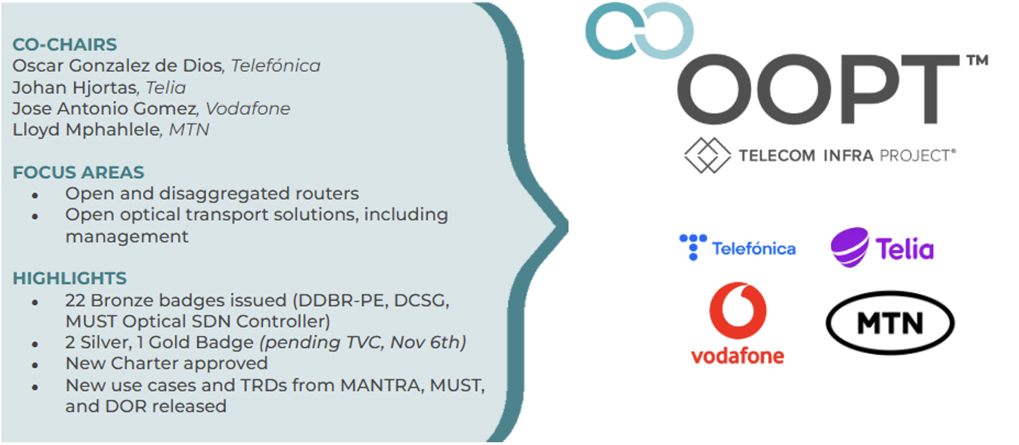 In 2024, TIP’s Open Optical & Packet Transport (OOPT) Project Group entered a pivotal new phase, consolidating successful initiatives and setting a five-year strategic vision through a new charter. The group also welcomed Lloyd Mphahlele (MTN Group) and José Antonio Gómez (Vodafone) as co-chairs to spearhead innovation in open transport networks. This shift aims to redefine telco networks by focusing on advanced use cases and the industrialization of open transport solutions.