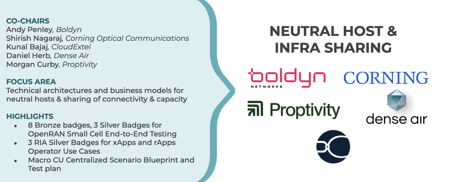 The Neutral Host & Infra Sharing (NHIS) Project Group was launched in 2024 with an ambitious set of initiatives for 2024. This new PG has a neutral host business model focused with specific emphasis on in-building systems (IBS), urban densification, and shared active and passive infrastructure to harvest the enormous economic benefits inherent in shared infra at the heart of the neutral host business model.