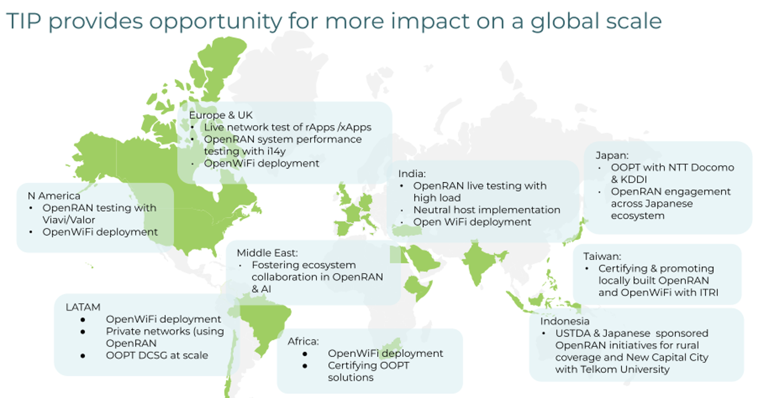 - Indonesia: TIP, in association with Telkom University, continues telco-led interoperability and system integration testing of OpenRAN, OOPT, and OpenWiFi configurations and will soon establish a forward-looking training curriculum with TIP Academy for the telecom operators for OpenRAN testing and certification.