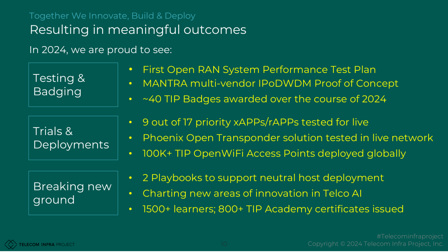 From breakthroughs in OpenRAN, Open Optical & Packet Transport and OpenWiFi to neutral host models and inserting AI architectures into Telco networks, our members have demonstrated the power of open collaboration this year. These successes reflect TIP’s mission to create economically viable, standards-based, interoperable & high-performance networks for all.