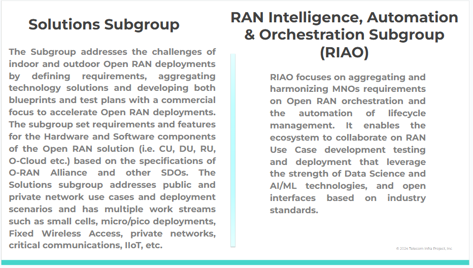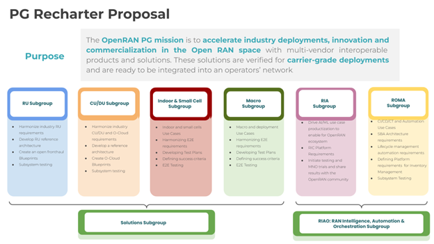 Currently, the PG consists of six subgroups addressing different aspects of Open RAN deployments, from Radio Units (RU) to orchestration and automation. However, we are excited to announce a proposed recharter that consolidates these efforts into two newly formed subgroups: the Solutions Subgroup and the RAN Intelligence, Automation & Orchestration (RIAO) Subgroup. This recharter reflects the growing need to streamline processes and drive faster adoption of OpenRAN solutions in the market.
